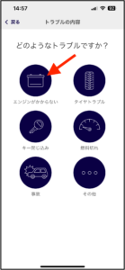 「どのようなトラブルですか?」に対して、「エンジンがかからない」を選択。