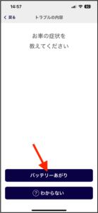「お車の症状を教えてください」に対して、「バッテリーあがり」を選択。